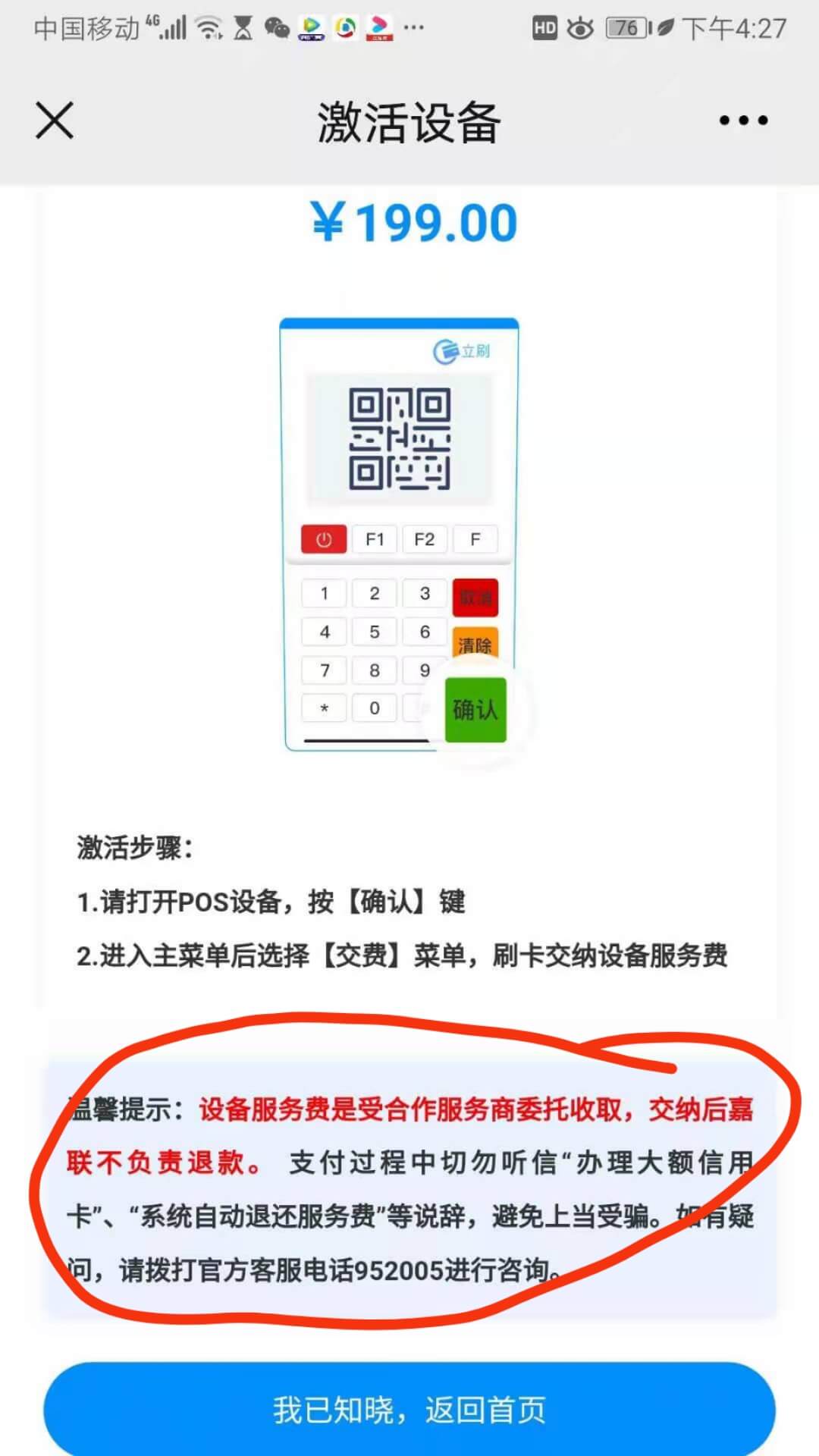 繳納服務費激活:立刷電簽版服務費有多個檔次,分別為0元激活服務費、49元激活服務費、69元激活服務費、99元激活服務費、199元激活服務費、249元激活服務費、具體的服務費金額是根據立刷電簽版POS機機具所屬代理商進行設置的,換句話來說也就是服務費并不是必須要繳納的,但是用戶一旦繳納服務費,將無法以任何形式退還。請千萬不要相信有些底層代理商所說的,3個月之后返還服務費或者1年之后返還服務費之類的話,這些都是騙人的,只是誘騙用戶繳納服務費。